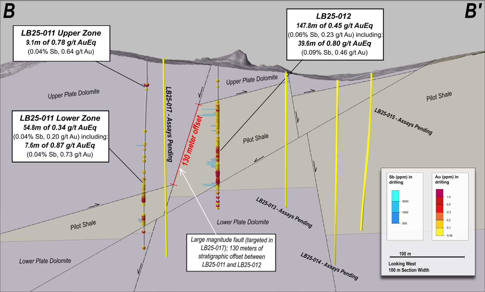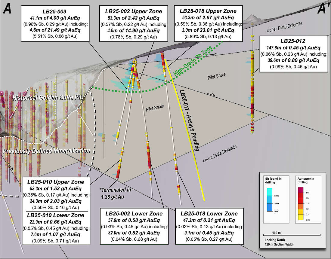 - LB25-010 Lower Zone (expansion): 1.07 g/t AuEq* over 7.6 meters (0.71 g/t Au and 0.09% Sb) within 0.66 g/t AuEq* over 22.9 meters (0.45 g/t Au and 0.05% Sb); Hole LB25-010 terminated in 1.38 g/t Au; follow-up drilling in 2026 is planned to expand the zone at depth