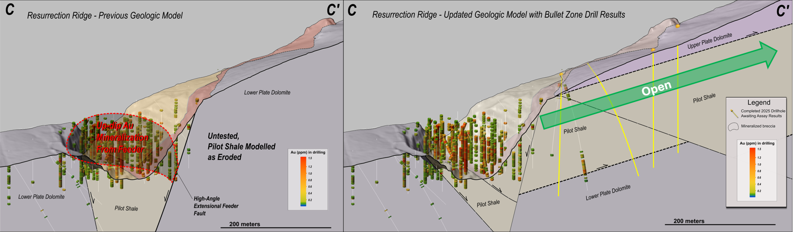 All holes drilled by the Company in 2025 with assays received have proven the new NevGold geological model. All holes collared in dolomite, passed through the upper thrust plate, and intersected gold and antimony at multiple horizons within the Pilot Shale. These drillhole results validate the new geological model and materially expand the potential mineralization footprint at the Project: the preserved Pilot Shale extends more than one kilometer east of prior drilling at Resurrection Ridge.