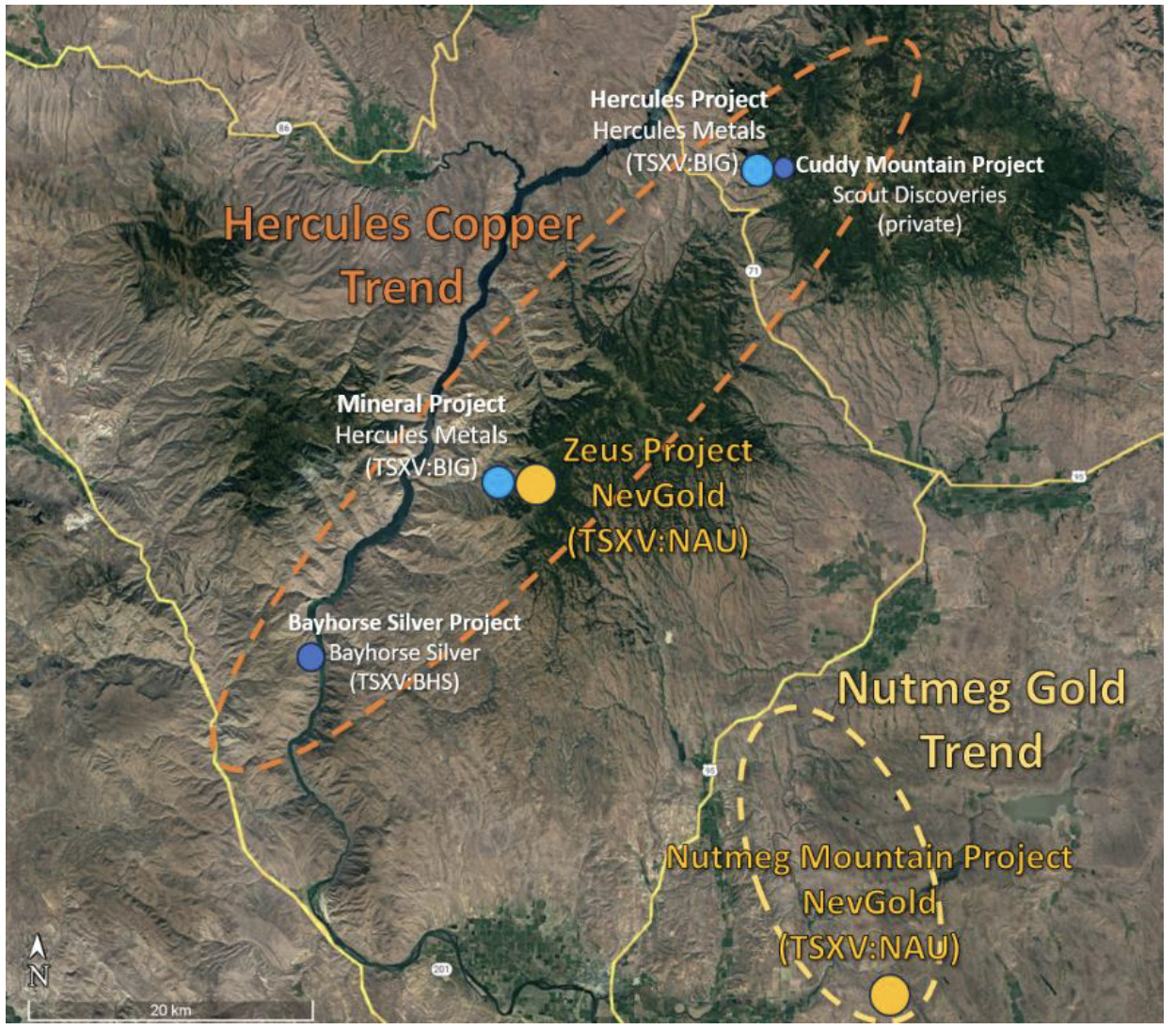 Vancouver, British Columbia – January 30, 2025 – NevGold Corp. (“NevGold” or the “Company”) (TSXV:NAU) (OTCQX:NAUFF) (Frankfurt:5E50) is pleased to announce that it has identified additional high-grade copper, gold, and silver mineralization at surface at the Zeus Copper Project in the emerging Hercules Copper District of southwestern Idaho. The additional positive sampling results highlight the significant copper porphyry potential at the Zeus Copper Project. As detailed in NevGold’s News Releases dated April 18, 2024 and June 20, 2024 (see NevGold News Releases), there are many similar geological characteristics between Hercules Metals Corp.’s (“Hercules Metals”, TSXV:BIG) copper porphyry discovery at the Hercules Project (see Hercules Metals News Release dated October 10, 2023), and the Zeus Copper Project, and both projects show similar surface sample results.