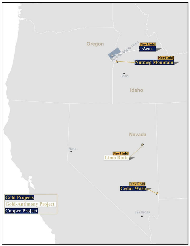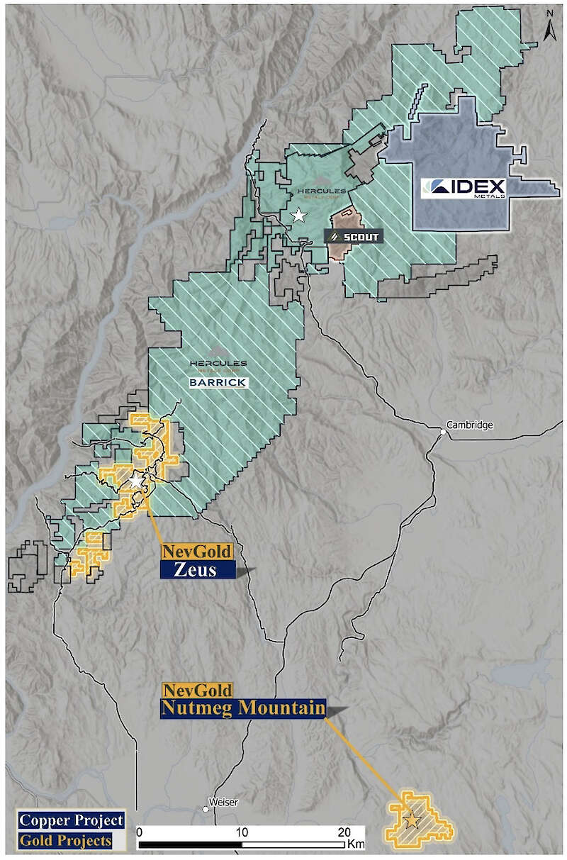 NevGold’s Zeus Copper Project (100% owned) is located in western Idaho approximately 35 kilometers northwest of our Nutmeg Mountain gold deposit (100 % owned). The property benefits from well-maintained historical roads, providing excellent access for exploration activities.