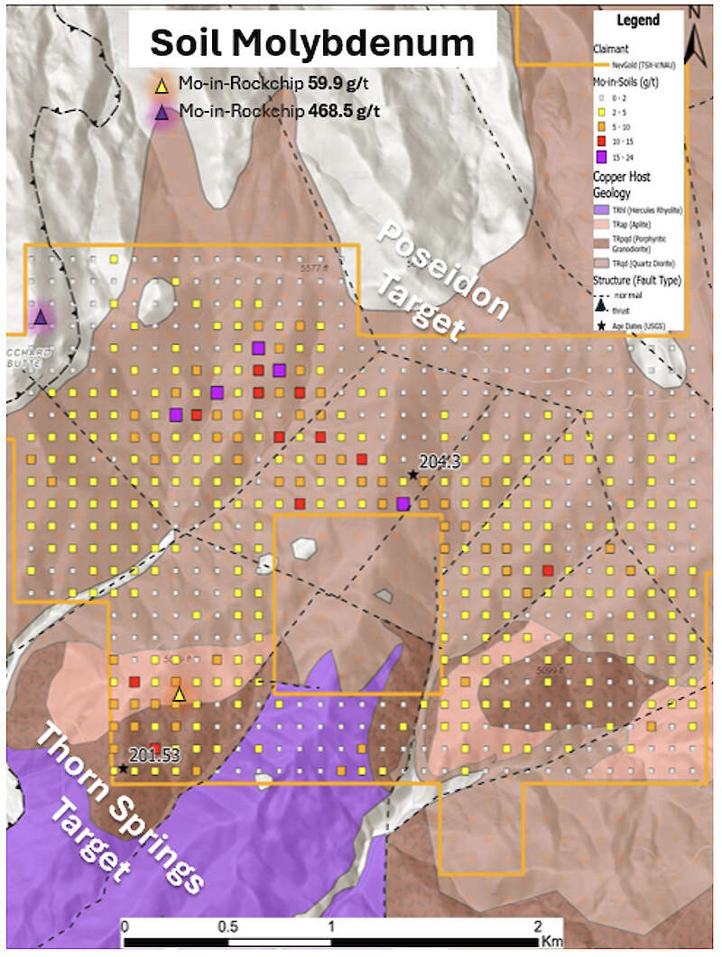 Surface soils to date have outlined a 2.4+ km copper-gold-molybdenum soil geochemical anomaly identified at the Poseidon Target on Bureau of Land Management (“BLM”) ground. Results including samples of 1,000 ppm copper, 183 ppb gold and 23 ppm molybdenum.