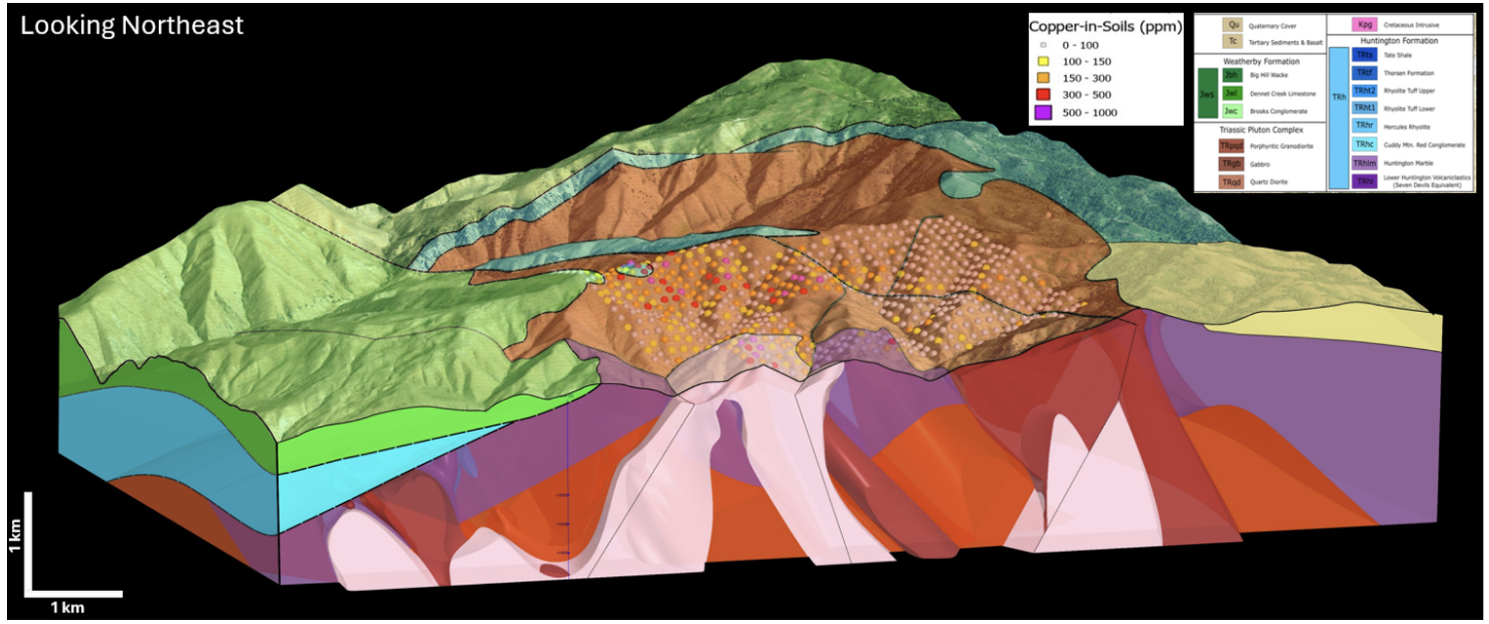 Figure 3 – Stratigraphy of the Hercules Copper Trend. The stratigraphy that is considered the most prospective to host porphyry copper mineralization includes the Lower Huntington Formation (purple) and Triassic age plutons (brown). Silver mineralization is known to be hosted in Upper Huntington Formation (blue), including the Hercules Rhyolite, as well as the underlying (older) stratigraphy.