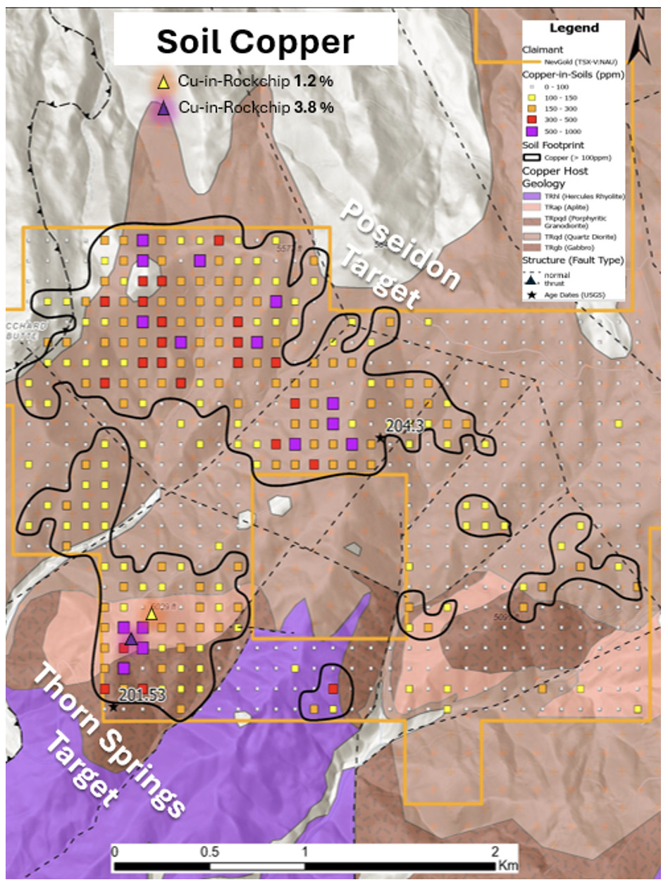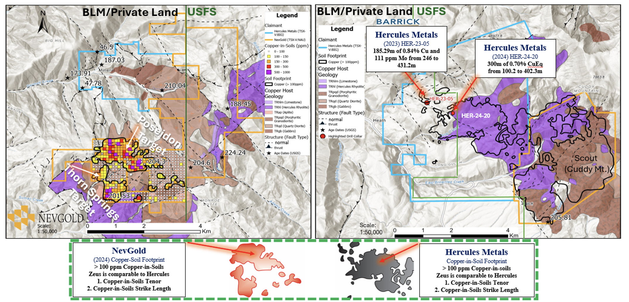 Initial surface soil and rock chip sampling by NevGold combined with historical data has identified multiple high-priority potential copper porphyry targets at the Zeus Copper Project. The results of the soil sampling reveal a multi-kilometer mineralized footprint with potential for multiple copper porphyry intrusive centers, showing tenor and scale analogous to the Hercules Metals copper porphyry discovery at the Hercules Project. The objective at the Zeus Project is the discovery of intrusive rocks with veining and alteration that are indicative of porphyry Cu-Au-Mo mineralization. The company plans to conduct a ground geophysical program including both IP and MT surveys to define drill targets within these anomalous zones.